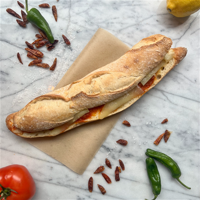Verse frites, gegrilde kip, sla, cheddar, rode ui snippers, piccalilly mayo. Medium of Large.
